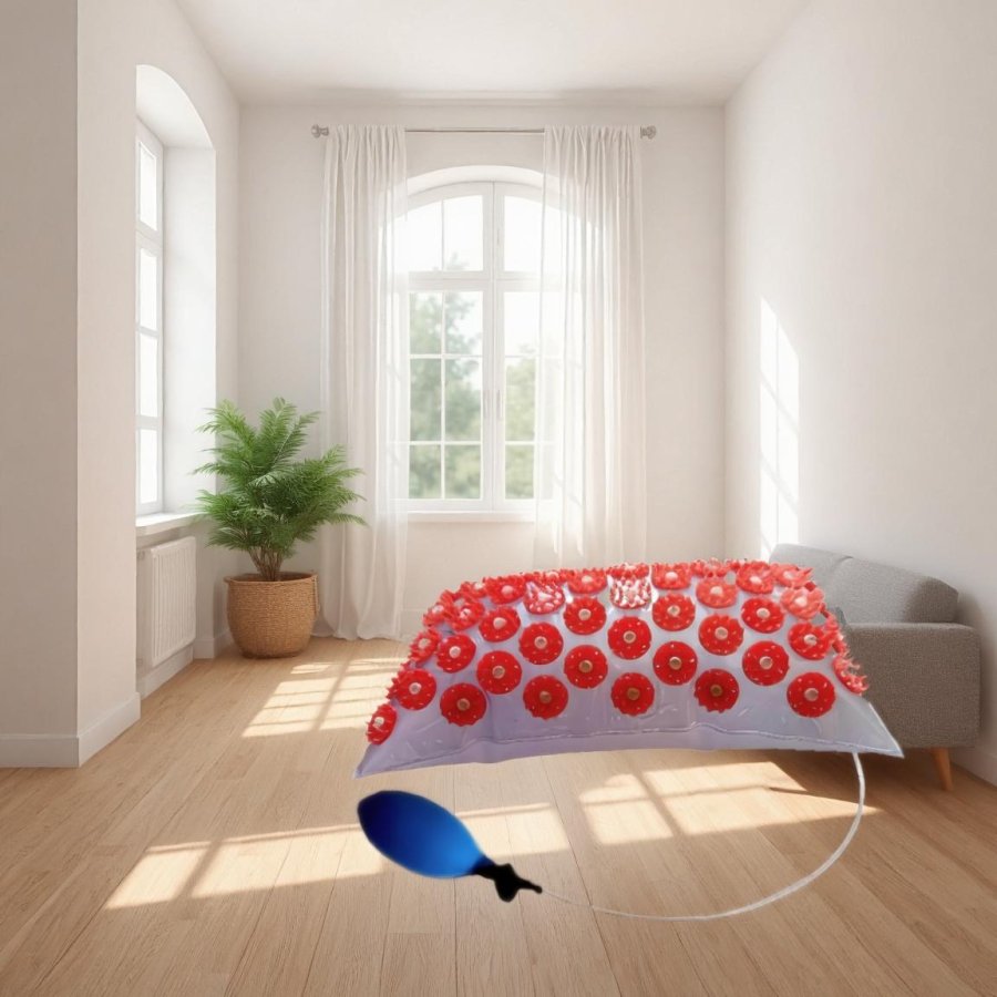 The E4 iplikator is a compact, hygienic inflatable acupressure pad designed for targeted stimulation of the cervical spine and lumbar region. Made from high-quality transparent PVC film, it can be easily inflated using a pump and is ideal for use at home, in nature, at the beach, or in wellness centers.